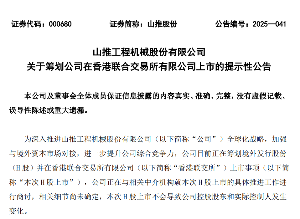 5月28日,山推股份(000680)公告称,公司目前正在筹划境外发行股份(H股)并在香港联交所上市。